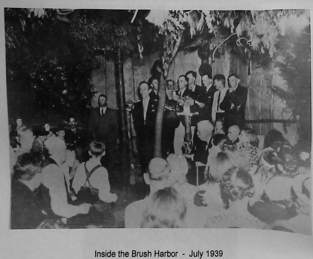 In June 1939, a small group of men from the community gathered to build a brush harbor on the land of George and Carl Kirk, located about two miles below Teas. This shelter, constructed from pine boughs and trees, served as a temporary but vital space for worship. The seats were rough wooden planks, and the pulpit was made from simple boards, with the ground serving as the floor. As the people gathered for services, Roy Redding, a young preacher, went door-to-door, inviting members of the surrounding communities, including Teas, Sugar Grove, and Stoney Battery, to attend the revival. He also brought along a collection of used clothes for those in need.